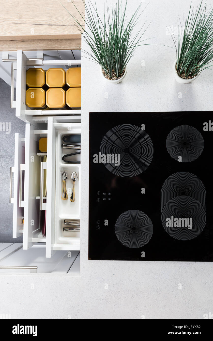 Top View Of Organized Kitchen Drawers And Electric Kitchen